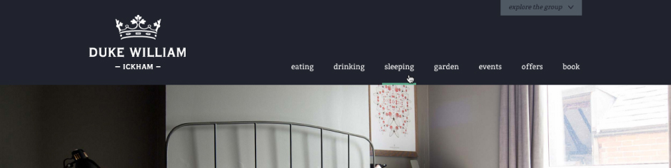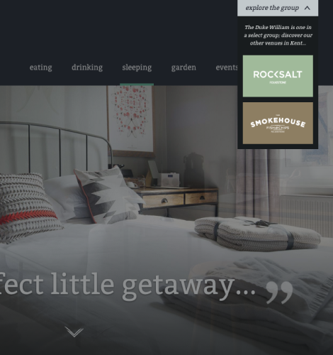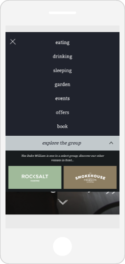 The website’s structure was led by the content, and with the goal of encouraging informed customers to visit firmly in mind. A clear plan with navigation to all services was settled on. In addition to providing relevant information to prospective visitors, we used the strong imagery provided to immerse the viewer - utilising both full screen photographs and galleries to give a sense of the pub’s atmosphere and aesthetic. A booking widget features on every page as a prompt to make a reservation, while also ensuring that this key interaction wasn’t tucked away and hard to find. Additionally, we needed to highlight the relationship between The Duke William and Mark’s other local ventures. This was worked into the main framework of the site, with a link to “explore the group” appearing alongside the top navigation and in the footer throughout.
